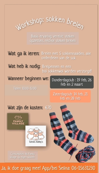 Voor iedereen die deelnam aan de eerste avond is dit bericht in het bijzonder een uitnodiging voor deze tweede bijeenkomst. Deze avond is ook goed te volgen zonder deelname aan de eerste avond. - Zie hiernaast de flyer voor de workshop sokken breien! In maart zal er nog een basisvaardigheden breien workshop starten. Klik hier voor die flyer.