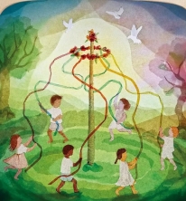 De meiboom, wordt door de mens opgericht tussen hemel en aarde, getooid met linten als takken. Het is een mooi beeld voor de opgerichte houding van de mens, met de linten als verbinding tussen hemel en aarde. De linten worden verweven in de Pinksterdansen.