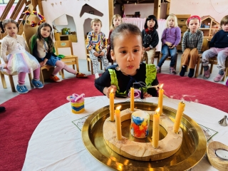 Gedurende de kleine pauze gaat de jarige met twee klasgenoten de klassen rond om felicitaties van de andere leraren te ontvangen. De kleuters vieren hun verjaardag alleen in hun eigen klas.
